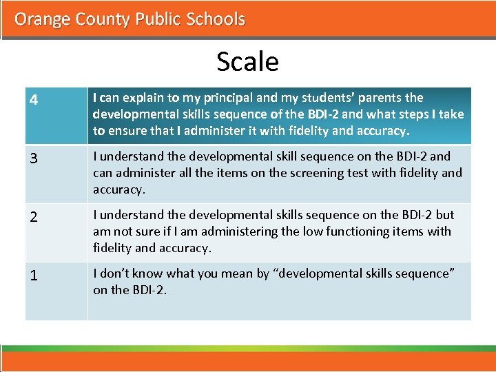 Scale 4 I can explain to my principal and my students’ parents the developmental skills sequence of the BDI-2 and what steps I take to ensure that I administer it with fidelity and accuracy. 3 I understand the developmental skill sequence on the BDI-2 and can administer all the items on the screening test with fidelity and accuracy. 2 I understand the developmental skills sequence on the BDI-2 but am not sure if I am administering the low functioning items with fidelity and accuracy. 1 I don’t know what you mean by “developmental skills sequence” on the BDI-2.