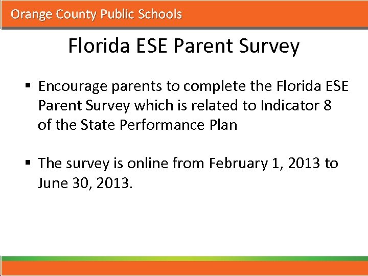 Florida ESE Parent Survey § Encourage parents to complete the Florida ESE Parent Survey which is related to Indicator 8 of the State Performance Plan § The survey is online from February 1, 2013 to June 30, 2013.
