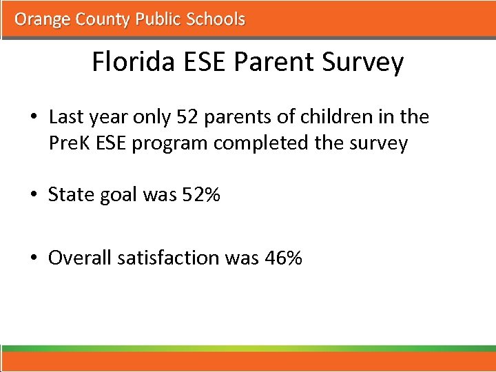Florida ESE Parent Survey • Last year only 52 parents of children in the Pre. K ESE program completed the survey • State goal was 52% • Overall satisfaction was 46%
