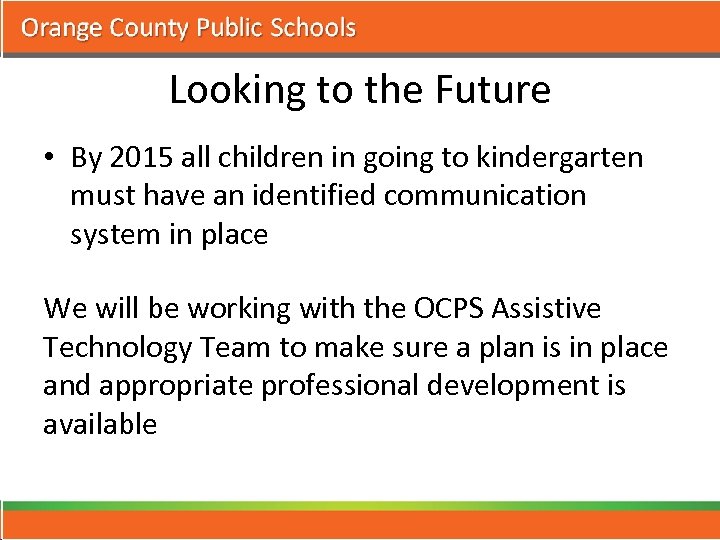 Looking to the Future • By 2015 all children in going to kindergarten must have an identified communication system in place We will be working with the OCPS Assistive Technology Team to make sure a plan is in place and appropriate professional development is available