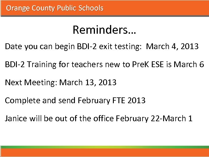 Reminders… Date you can begin BDI-2 exit testing: March 4, 2013 BDI-2 Training for teachers new to Pre. K ESE is March 6 Next Meeting: March 13, 2013 Complete and send February FTE 2013 Janice will be out of the office February 22 -March 1