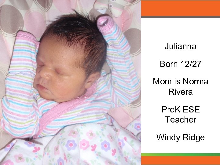 Julianna Born 12/27 Mom is Norma Rivera Pre. K ESE Teacher Windy Ridge