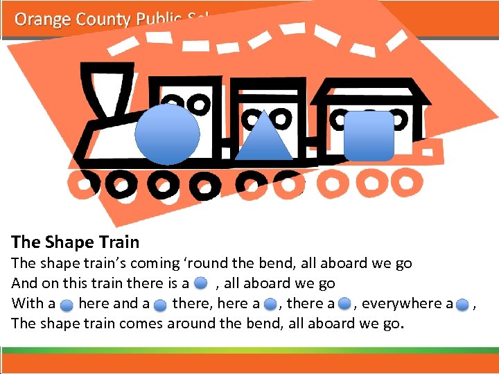 The Shape Train The shape train’s coming ‘round the bend, all aboard we go And on this train there is a , all aboard we go With a here and a there, here a , there a , everywhere a , The shape train comes around the bend, all aboard we go.