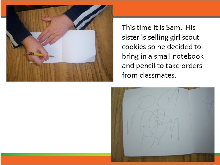 This time it is Sam. His sister is selling girl scout cookies so he decided to bring in a small notebook and pencil to take orders from classmates.