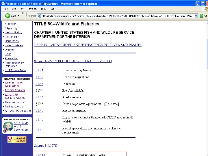 Sources of Federal Administrative Materials ■ Federal Register (FR) (print, Lexis/Westlaw, Internet) published daily A “notice” publication; includes proposed and final new and amended regs, as well as other agency materials ■ Code of Federal Regulations (CFR) (print, Lexis/Westlaw, Internet) topical arrangement of regulations currently in effect each title is updated (republished) at least once a year ■ Agency Web sites often include text of regulations, but not necessarily up-todate