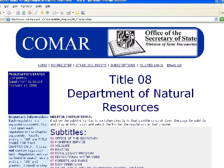 Sources of Maryland Administrative Materials Maryland Register (print, Lexis/Westlaw, Internet) published biweekly, proposed and final new and amended regs, other agency materials Code of Maryland Administrative Regulations (COMAR) (print, Lexis/Westlaw, Internet) text of regulations currently in effect, arranged by topic each title is updated at least once a year Agency Web sites usually do not provide text of regulations