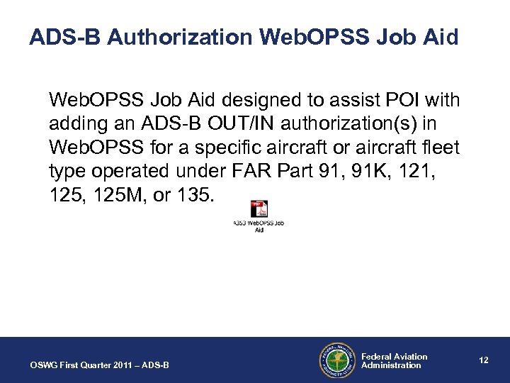 ADS-B Authorization Web. OPSS Job Aid designed to assist POI with adding an ADS-B OUT/IN authorization(s) in Web. OPSS for a specific aircraft or aircraft fleet type operated under FAR Part 91, 91 K, 121, 125 M, or 135. OSWG First Quarter 2011 – ADS-B Federal Aviation Administration 12