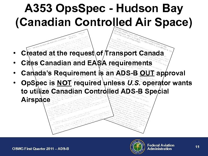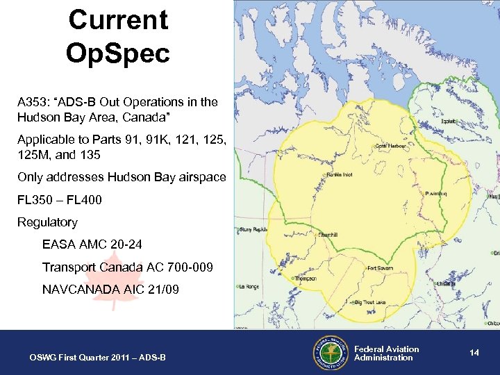 Current Op. Spec A 353: “ADS-B Out Operations in the Hudson Bay Area, Canada” Applicable to Parts 91, 91 K, 121, 125 M, and 135 Only addresses Hudson Bay airspace FL 350 – FL 400 Regulatory EASA AMC 20 -24 Transport Canada AC 700 -009 NAVCANADA AIC 21/09 OSWG First Quarter 2011 – ADS-B Federal Aviation Administration 14