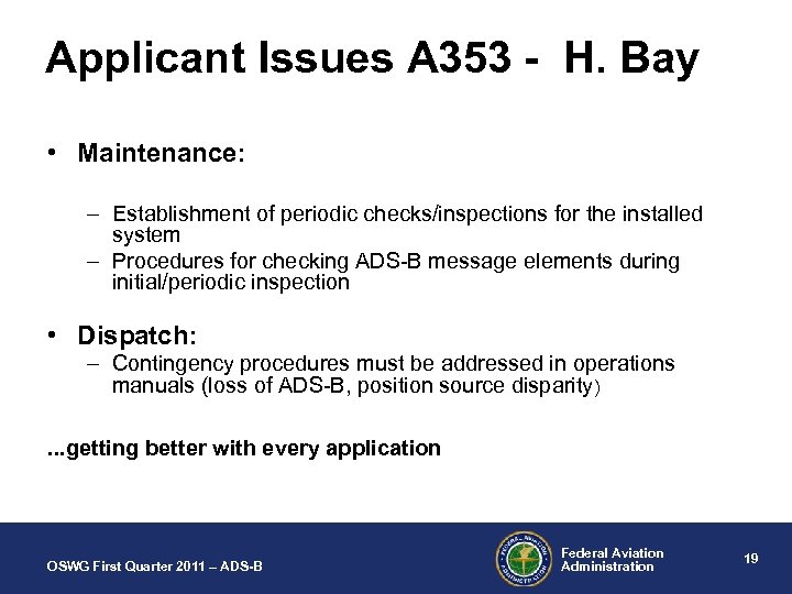 Applicant Issues A 353 – H. Bay • Operational: – Misunderstanding/confusion between ADS-B & ADS-C. – Flight manuals must address system configuration & control (e. g. if you turn off transponder, you also disable ADS-B and TCAS) – Loss of capability; Emergency Codes – AFM compliance statement • Training: – ADS-B phraseology – Specific training for Dispatch, Pilots and Maintenance personnel OSWG First Quarter 2011 – ADS-B Federal Aviation Administration 18