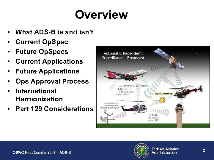 Overview • • What ADS-B is and isn’t Current Op. Spec Future Op. Specs Current Applications Future Applications Ops Approval Process International Harmonization • Part 129 Considerations OSWG First Quarter 2011 – ADS-B Federal Aviation Administration 2
