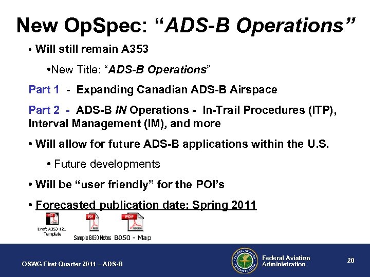 Applicant Issues A 353 - H. Bay • Maintenance: – Establishment of periodic checks/inspections for the installed system – Procedures for checking ADS-B message elements during initial/periodic inspection • Dispatch: – Contingency procedures must be addressed in operations manuals (loss of ADS-B, position source disparity). . . getting better with every application OSWG First Quarter 2011 – ADS-B Federal Aviation Administration 19