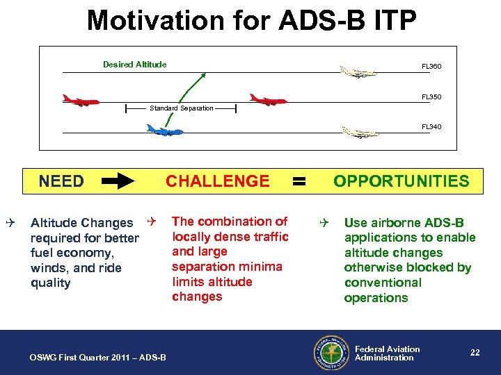 ADS-B IN - applications Active development In Trail Procedures (ITP) OSWG First Quarter 2011 – ADS-B Federal Aviation Administration 21