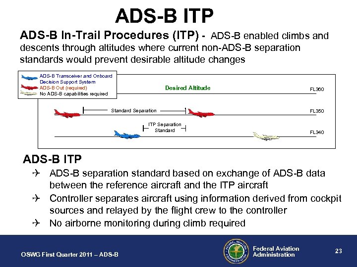 Motivation for ADS-B ITP Desired Altitude FL 360 FL 350 Standard Separation FL 340 NEED Q CHALLENGE Altitude Changes Q required for better fuel economy, winds, and ride quality OSWG First Quarter 2011 – ADS-B = The combination of locally dense traffic and large separation minima limits altitude changes OPPORTUNITIES Q Use airborne ADS-B applications to enable altitude changes otherwise blocked by conventional operations Federal Aviation Administration 22
