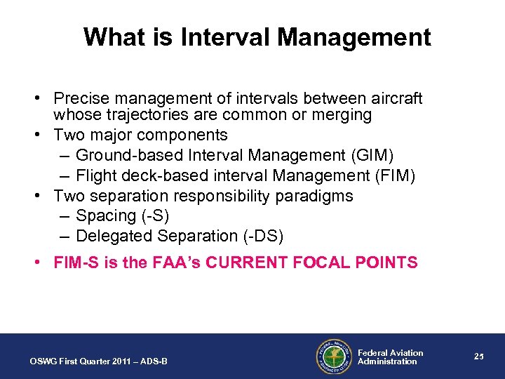 Developing Applications: Interval Management (IM) OSWG First Quarter 2011 – ADS-B Federal Aviation Administration 24