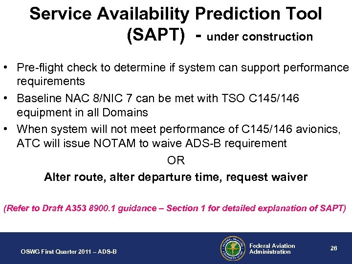 Service Availability Prediction Tool (SAPT) - under construction • Pre-flight check to determine if system can support performance requirements • Baseline NAC 8/NIC 7 can be met with TSO C 145/146 equipment in all Domains • When system will not meet performance of C 145/146 avionics, ATC will issue NOTAM to waive ADS-B requirement OR Alter route, alter departure time, request waiver (Refer to Draft A 353 8900. 1 guidance – Section 1 for detailed explanation of SAPT) OSWG First Quarter 2011 – ADS-B Federal Aviation Administration 26