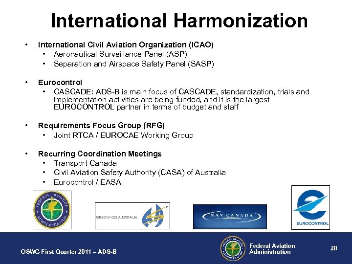 International Harmonization • International Civil Aviation Organization (ICAO) • Aeronautical Surveillance Panel (ASP) • Separation and Airspace Safety Panel (SASP) • Eurocontrol • CASCADE: ADS-B is main focus of CASCADE, standardization, trials and implementation activities are being funded, and it is the largest EUROCONTROL partner in terms of budget and staff • Requirements Focus Group (RFG) • Joint RTCA / EUROCAE Working Group • Recurring Coordination Meetings • Transport Canada • Civil Aviation Safety Authority (CASA) of Australia • Eurocontrol / EASA OSWG First Quarter 2011 – ADS-B Federal Aviation Administration 28