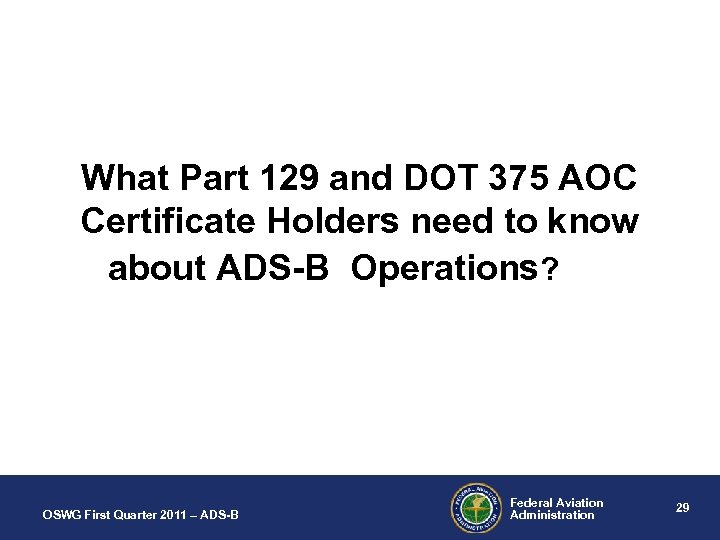 What Part 129 and DOT 375 AOC Certificate Holders need to know about ADS-B Operations? OSWG First Quarter 2011 – ADS-B Federal Aviation Administration 29