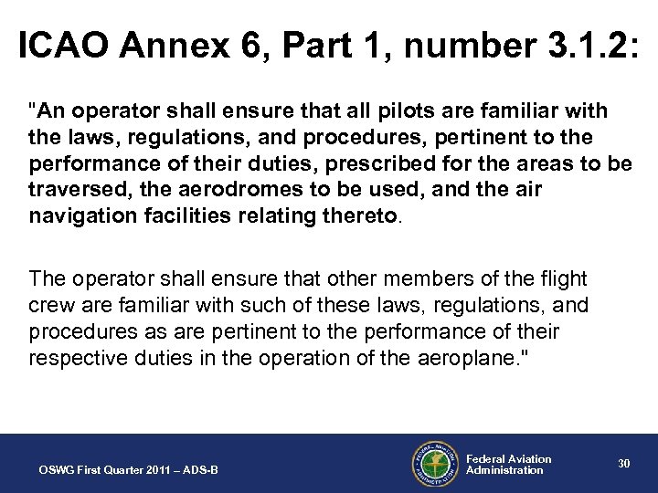 ICAO Annex 6, Part 1, number 3. 1. 2: "An operator shall ensure that all pilots are familiar with the laws, regulations, and procedures, pertinent to the performance of their duties, prescribed for the areas to be traversed, the aerodromes to be used, and the air navigation facilities relating thereto. The operator shall ensure that other members of the flight crew are familiar with such of these laws, regulations, and procedures as are pertinent to the performance of their respective duties in the operation of the aeroplane. " OSWG First Quarter 2011 – ADS-B Federal Aviation Administration 30
