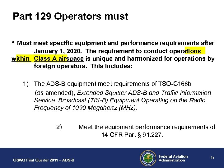 Part 129 Operators must • Must meet specific equipment and performance requirements after January 1, 2020. The requirement to conduct operations within Class A airspace is unique and harmonized for operations by foreign operators. This includes: 1) The ADS-B equipment meet requirements of TSO-C 166 b (as amended), Extended Squitter ADS-B and Traffic Information Service–Broadcast (TIS-B) Equipment Operating on the Radio Frequency of 1090 Megahertz (MHz). 2) OSWG First Quarter 2011 – ADS-B Meet the equipment performance requirements of 14 CFR Part § 91. 227. Federal Aviation Administration 31