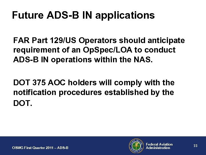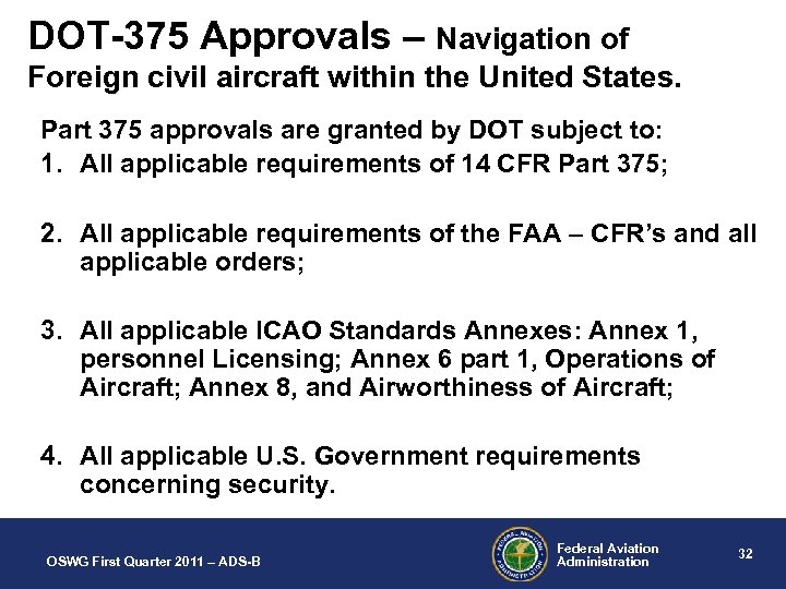 DOT-375 Approvals – Navigation of Foreign civil aircraft within the United States. Part 375 approvals are granted by DOT subject to: 1. All applicable requirements of 14 CFR Part 375; 2. All applicable requirements of the FAA – CFR’s and all applicable orders; 3. All applicable ICAO Standards Annexes: Annex 1, personnel Licensing; Annex 6 part 1, Operations of Aircraft; Annex 8, and Airworthiness of Aircraft; 4. All applicable U. S. Government requirements concerning security. OSWG First Quarter 2011 – ADS-B Federal Aviation Administration 32