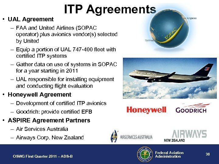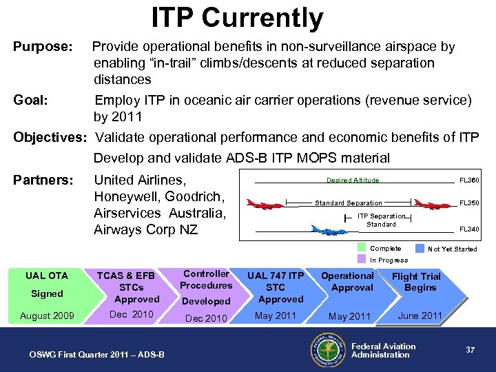 • UAL Agreement ITP Agreements – FAA and United Airlines (SOPAC operator) plus avionics vendor(s) selected by United – Equip a portion of UAL 747 -400 fleet with certified ITP systems – Gather data on use of systems in SOPAC for a year starting in 2011 – UAL responsible for installing equipment and conducting flight evaluation • Honeywell Agreement – Development of certified ITP avionics – Goodrich: provide certified EFB • ASPIRE Agreement Partners – Air Services Australia – Airways Corp. New Zealand OSWG First Quarter 2011 – ADS-B Federal Aviation Administration 36