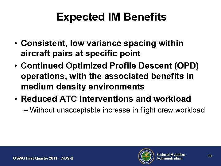 Expected IM Benefits • Consistent, low variance spacing within aircraft pairs at specific point • Continued Optimized Profile Descent (OPD) operations, with the associated benefits in medium density environments • Reduced ATC interventions and workload – Without unacceptable increase in flight crew workload OSWG First Quarter 2011 – ADS-B Federal Aviation Administration 38