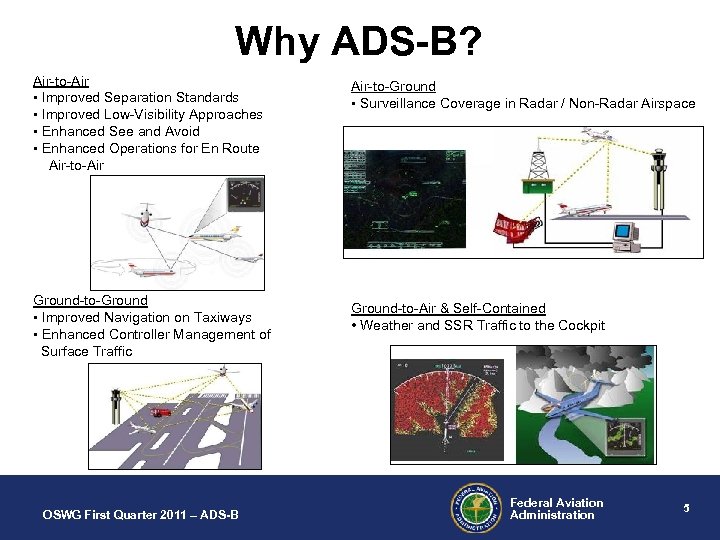 Introduction to ADS-B • Automatic – Periodically transmits information with no pilot or operator input required • Dependent – Position and velocity vector are derived from the Global Positioning System (GPS) • Surveillance – A method of determining position of aircraft, vehicles, or other assets • Broadcast – Transmitted information available to anyone with the appropriate receiving equipment OSWG First Quarter 2011 – ADS-B Federal Aviation Administration 4