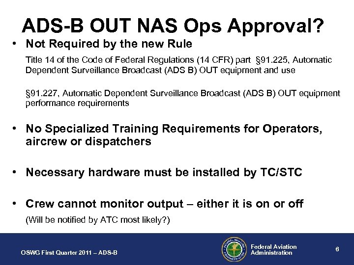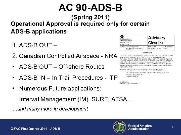 ADS-B OUT NAS Ops Approval? • Not Required by the new Rule Title 14 of the Code of Federal Regulations (14 CFR) part § 91. 225, Automatic Dependent Surveillance Broadcast (ADS B) OUT equipment and use § 91. 227, Automatic Dependent Surveillance Broadcast (ADS B) OUT equipment performance requirements • No Specialized Training Requirements for Operators, aircrew or dispatchers • Necessary hardware must be installed by TC/STC • Crew cannot monitor output – either it is on or off (Will be notified by ATC most likely? ) OSWG First Quarter 2011 – ADS-B Federal Aviation Administration 6
