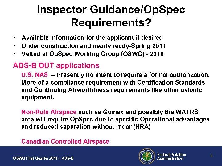 AC 90 -ADS-B (Spring 2011) Operational Approval is required only for certain ADS-B applications: 1. ADS-B OUT – 2. Canadian Controlled Airspace - NRA • ADS-B OUT – Off-shore Routes • ADS-B IN – In Trail Procedures - ITP • Numerous Future applications: Interval Management (IM), SURF, ATSA… …and many more in development OSWG First Quarter 2011 – ADS-B Federal Aviation Administration 7