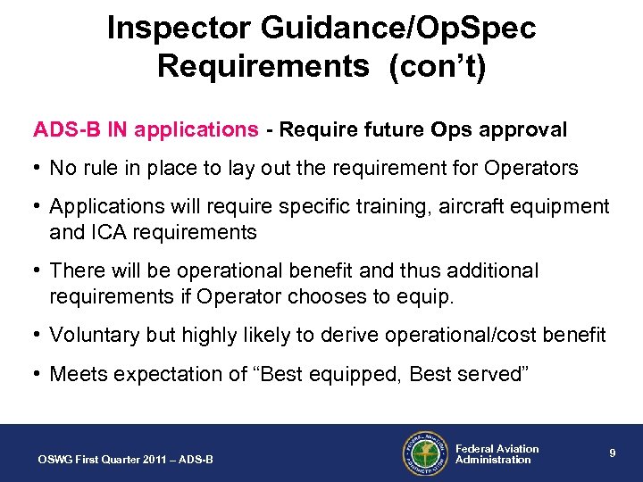 Inspector Guidance/Op. Spec Requirements? • Available information for the applicant if desired • Under construction and nearly ready-Spring 2011 • Vetted at Op. Spec Working Group (OSWG) - 2010 ADS-B OUT applications U. S. NAS – Presently no intent to require a formal authorization. More of a compliance requirement with Certification Standards and Continuing Airworthiness requirements like other avionic equipment. Non-Rule Airspace such as Gomex and possibly the WATRS area will require Op. Spec due to specific Operational advantages and reduced separation without radar (NRA) Canadian Controlled Airspace OSWG First Quarter 2011 – ADS-B Federal Aviation Administration 8