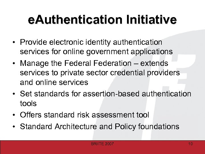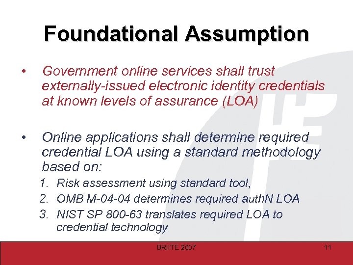e. Authentication Initiative • Provide electronic identity authentication services for online government applications • Manage the Federal Federation – extends services to private sector credential providers and online services • Set standards for assertion-based authentication tools • Offers standard risk assessment tool • Standard Architecture and Policy foundations BRIITE 2007 10