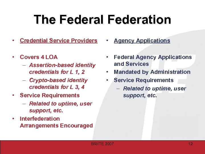 Foundational Assumption • Government online services shall trust externally-issued electronic identity credentials at known levels of assurance (LOA) • Online applications shall determine required credential LOA using a standard methodology based on: 1. Risk assessment using standard tool, 2. OMB M-04 -04 determines required auth. N LOA 3. NIST SP 800 -63 translates required LOA to credential technology BRIITE 2007 11