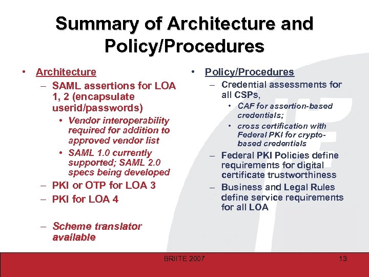 The Federal Federation • Credential Service Providers • Agency Applications • Covers 4 LOA – Assertion-based identity credentials for L 1, 2 – Crypto-based identity credentials for L 3, 4 • Service Requirements – Related to uptime, user support, etc. • Interfederation Arrangements Encouraged • Federal Agency Applications and Services • Mandated by Administration • Service Requirements – Related to uptime, user support, etc. BRIITE 2007 12