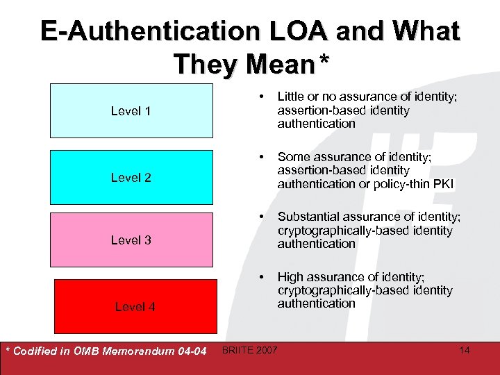 Summary of Architecture and Policy/Procedures • Architecture – SAML assertions for LOA 1, 2 (encapsulate userid/passwords) • Policy/Procedures • Vendor interoperability required for addition to approved vendor list • SAML 1. 0 currently supported; SAML 2. 0 specs being developed – PKI or OTP for LOA 3 – PKI for LOA 4 – Credential assessments for all CSPs, • CAF for assertion-based credentials; • cross certification with Federal PKI for cryptobased credentials – Federal PKI Policies define requirements for digital certificate trustworthiness – Business and Legal Rules define service requirements for all LOA – Scheme translator available BRIITE 2007 13