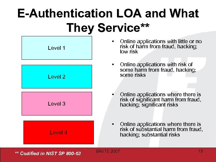 E-Authentication LOA and What They Mean* • Little or no assurance of identity; assertion-based identity authentication • Some assurance of identity; assertion-based identity authentication or policy-thin PKI • Substantial assurance of identity; cryptographically-based identity authentication • High assurance of identity; cryptographically-based identity authentication Level 1 Level 2 Level 3 Level 4 * Codified in OMB Memorandum 04 -04 BRIITE 2007 14