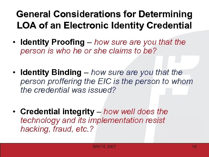 E-Authentication LOA and What They Service** • Online applications with little or no risk of harm from fraud, hacking; low risk • Online applications with risk of some harm from fraud, hacking; some risks • Online applications where there is risk of significant harm from fraud, hacking; significant risks • Online applications where there is risk of substantial harm from fraud, hacking; substantial risks Level 1 Level 2 Level 3 Level 4 ** Codified in NIST SP 800 -63 BRIITE 2007 15