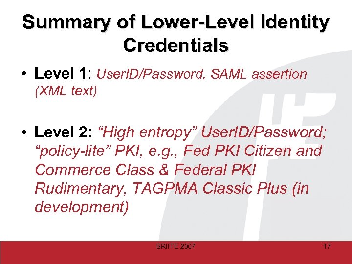 Summary of Lower-Level Identity Credentials • Level 1: User. ID/Password, SAML assertion (XML text) • Level 2: “High entropy” User. ID/Password; “policy-lite” PKI, e. g. , Fed PKI Citizen and Commerce Class & Federal PKI Rudimentary, TAGPMA Classic Plus (in development) BRIITE 2007 17