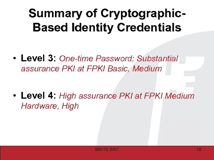 Summary of Cryptographic. Based Identity Credentials • Level 3: One-time Password; Substantial assurance PKI at FPKI Basic, Medium • Level 4: High assurance PKI at FPKI Medium Hardware, High BRIITE 2007 18