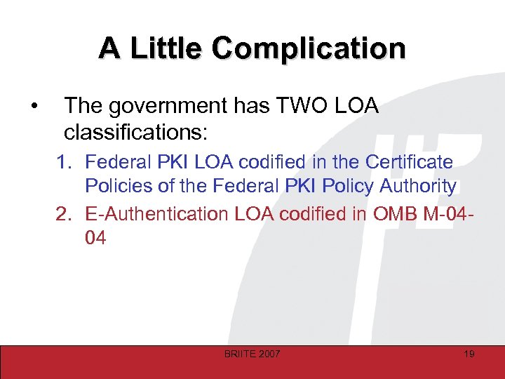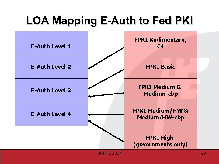 A Little Complication • The government has TWO LOA classifications: 1. Federal PKI LOA codified in the Certificate Policies of the Federal PKI Policy Authority 2. E-Authentication LOA codified in OMB M-0404 BRIITE 2007 19