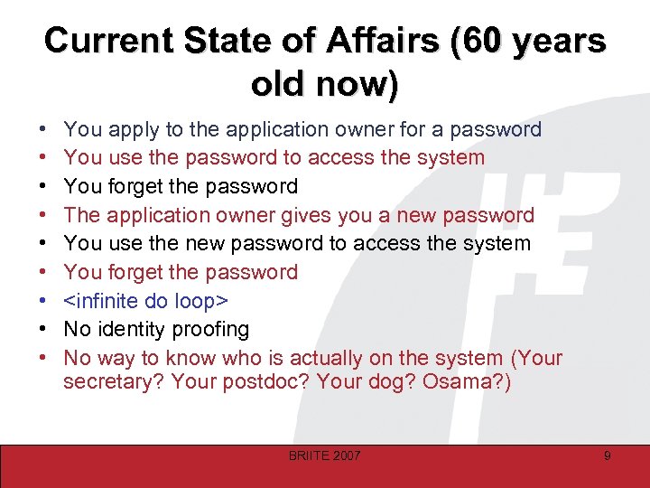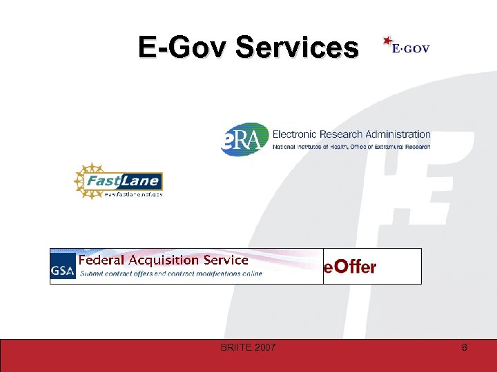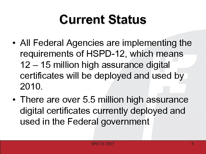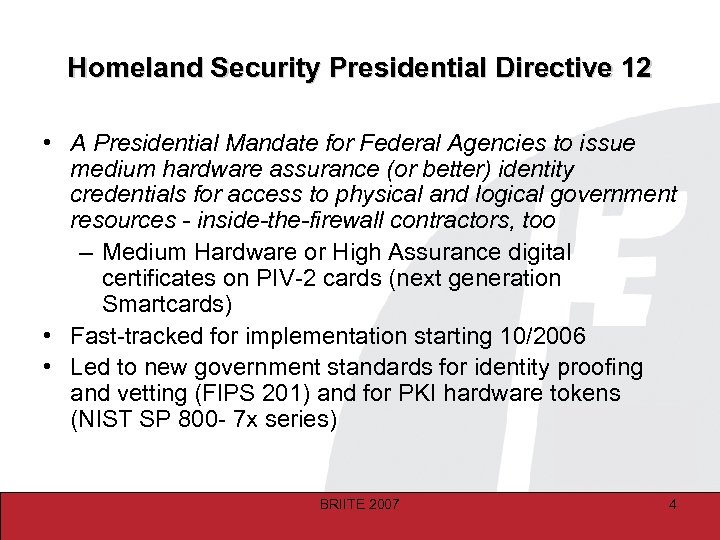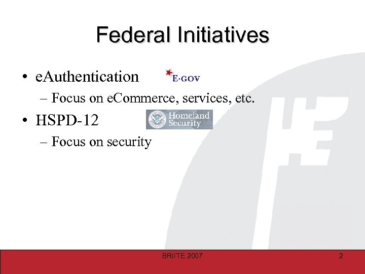 Federal Initiatives • e. Authentication – Focus on e. Commerce, services, etc. • HSPD-12 – Focus on security BRIITE 2007 2