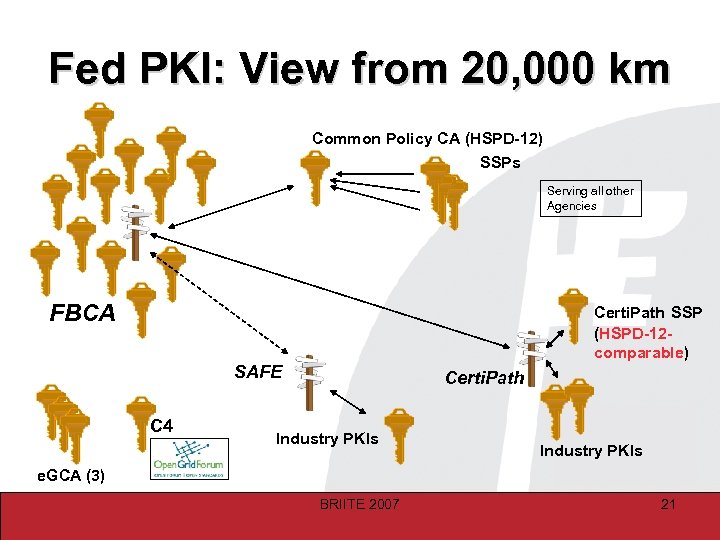 Fed PKI: View from 20, 000 km Common Policy CA (HSPD-12) SSPs Serving all other Agencies FBCA Certi. Path SSP (HSPD-12 comparable) SAFE C 4 Certi. Path Industry PKIs e. GCA (3) BRIITE 2007 21