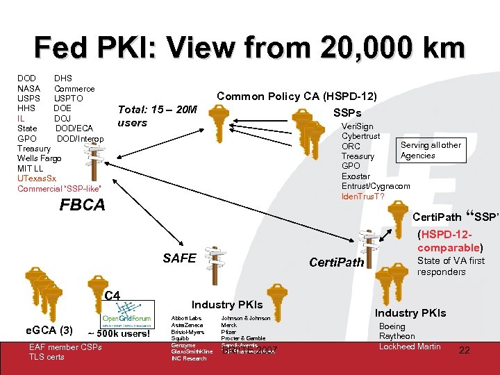 Fed PKI: View from 20, 000 km DOD DHS NASA Commerce USPS USPTO HHS DOE IL DOJ State DOD/ECA GPO DOD/Interop Treasury Wells Fargo MIT LL UTexas. Sx Commercial “SSP-like” Total: 15 – 20 M users Common Policy CA (HSPD-12) SSPs Veri. Sign Cybertrust Serving all other ORC Agencies Treasury GPO Exostar Entrust/Cygnacom Iden. Trus. T? FBCA Certi. Path (HSPD-12 comparable) SAFE C 4 e. GCA (3) ~ 500 k users! EAF member CSPs TLS certs Certi. Path Industry PKIs Abbott Labs Astra. Zeneca Bristol-Myers Squibb Genzyme Glaxo. Smith. Kline INC Research “SSP” Johnson & Johnson Merck Pfizer Procter & Gamble Sanofi-Aventis TAP Pharmaceuticals BRIITE 2007 State of VA first responders Industry PKIs Boeing Raytheon Lockheed Martin 22