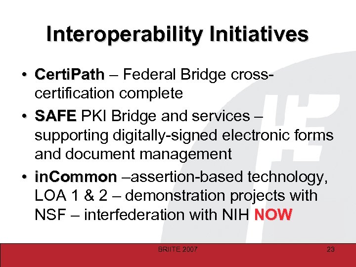 Interoperability Initiatives • Certi. Path – Federal Bridge crosscertification complete • SAFE PKI Bridge and services – supporting digitally-signed electronic forms and document management • in. Common –assertion-based technology, LOA 1 & 2 – demonstration projects with NSF – interfederation with NIH NOW BRIITE 2007 23