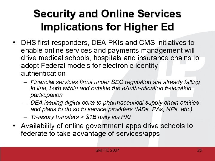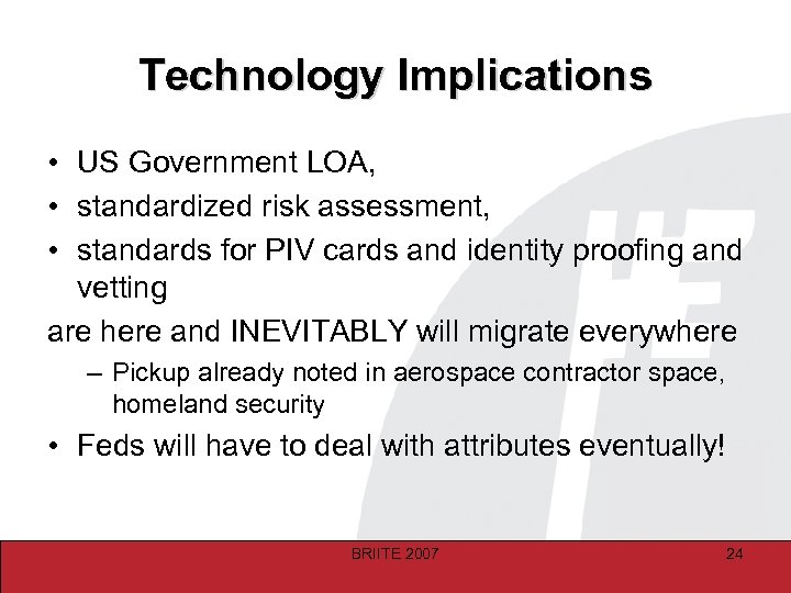 Technology Implications • US Government LOA, • standardized risk assessment, • standards for PIV cards and identity proofing and vetting are here and INEVITABLY will migrate everywhere – Pickup already noted in aerospace contractor space, homeland security • Feds will have to deal with attributes eventually! BRIITE 2007 24