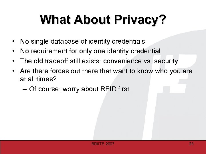 What About Privacy? • • No single database of identity credentials No requirement for only one identity credential The old tradeoff still exists: convenience vs. security Are there forces out there that want to know who you are at all times? – Of course; worry about RFID first. BRIITE 2007 26
