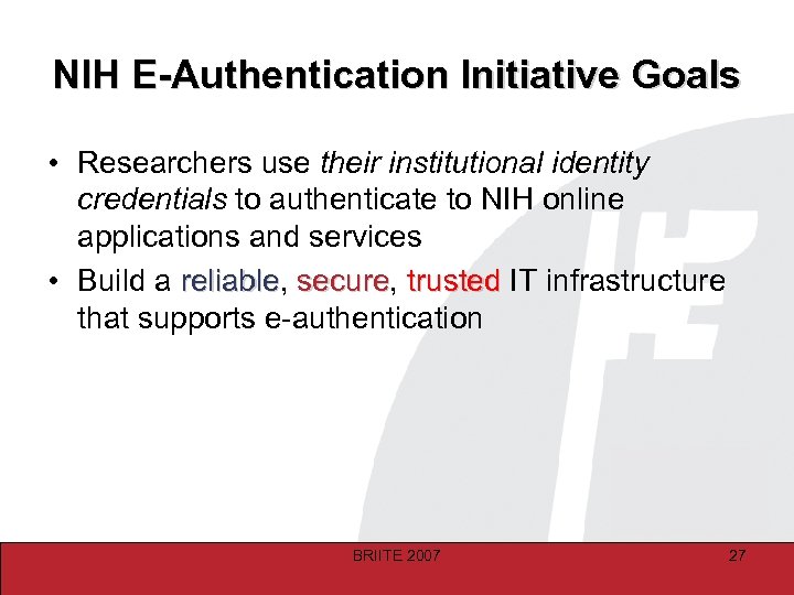 NIH E-Authentication Initiative Goals • Researchers use their institutional identity credentials to authenticate to NIH online applications and services • Build a reliable, secure, trusted IT infrastructure reliable secure that supports e-authentication BRIITE 2007 27