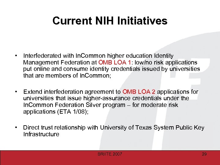 NIH E-Authentication Initiative Goals • Researchers use their institutional identity credentials to authenticate to NIH online applications and services • Build a reliable, secure, trusted IT infrastructure reliable secure that supports e-authentication BRIITE 2007 28