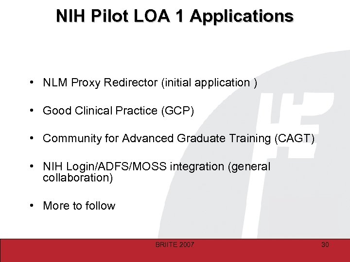 Current NIH Initiatives • Interfederated with In. Common higher education Identity Management Federation at OMB LOA 1: low/no risk applications put online and consume identity credentials issued by universities that are members of In. Common; • Extend interfederation agreement to OMB LOA 2 applications for universities that issue higher-assurance credentials under the In. Common Federation Silver program – for moderate risk applications (ETA 1/08); • Direct trust relationship with University of Texas System Public Key Infrastructure BRIITE 2007 29