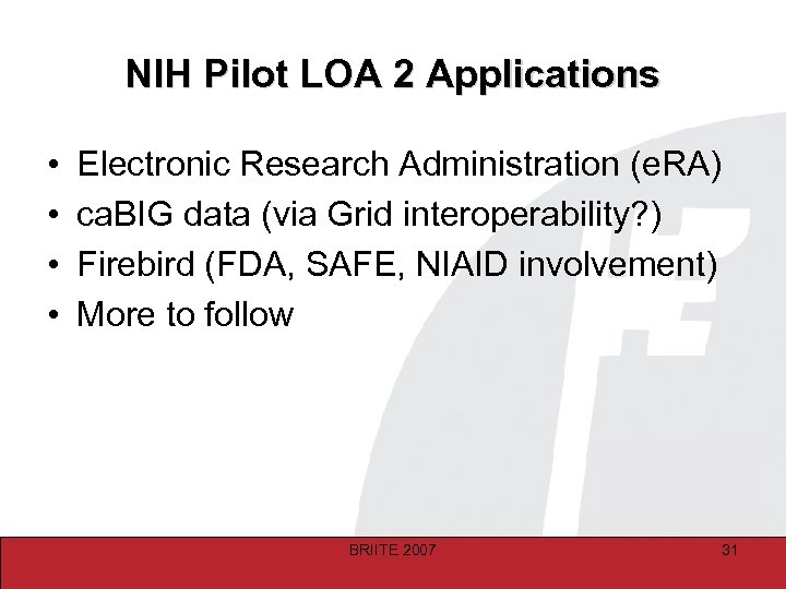 NIH Pilot LOA 2 Applications • • Electronic Research Administration (e. RA) ca. BIG data (via Grid interoperability? ) Firebird (FDA, SAFE, NIAID involvement) More to follow BRIITE 2007 31