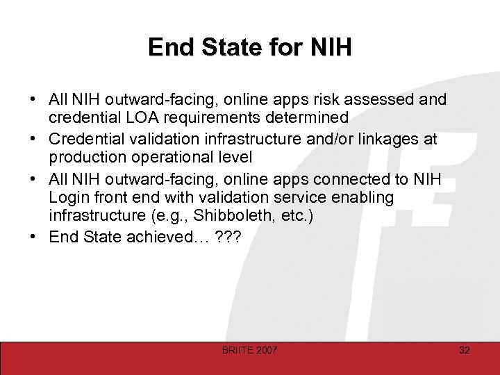 End State for NIH • All NIH outward-facing, online apps risk assessed and credential LOA requirements determined • Credential validation infrastructure and/or linkages at production operational level • All NIH outward-facing, online apps connected to NIH Login front end with validation service enabling infrastructure (e. g. , Shibboleth, etc. ) • End State achieved… ? ? ? BRIITE 2007 32